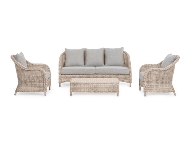 Struttura in alluminio verniciato a polvere (poliestere), intreccio in fibra sintetica (tondo 5, 3mm). Cuscini sfoderabili con tessuto idrorepellente sunproof olefin (100% polypropylene).