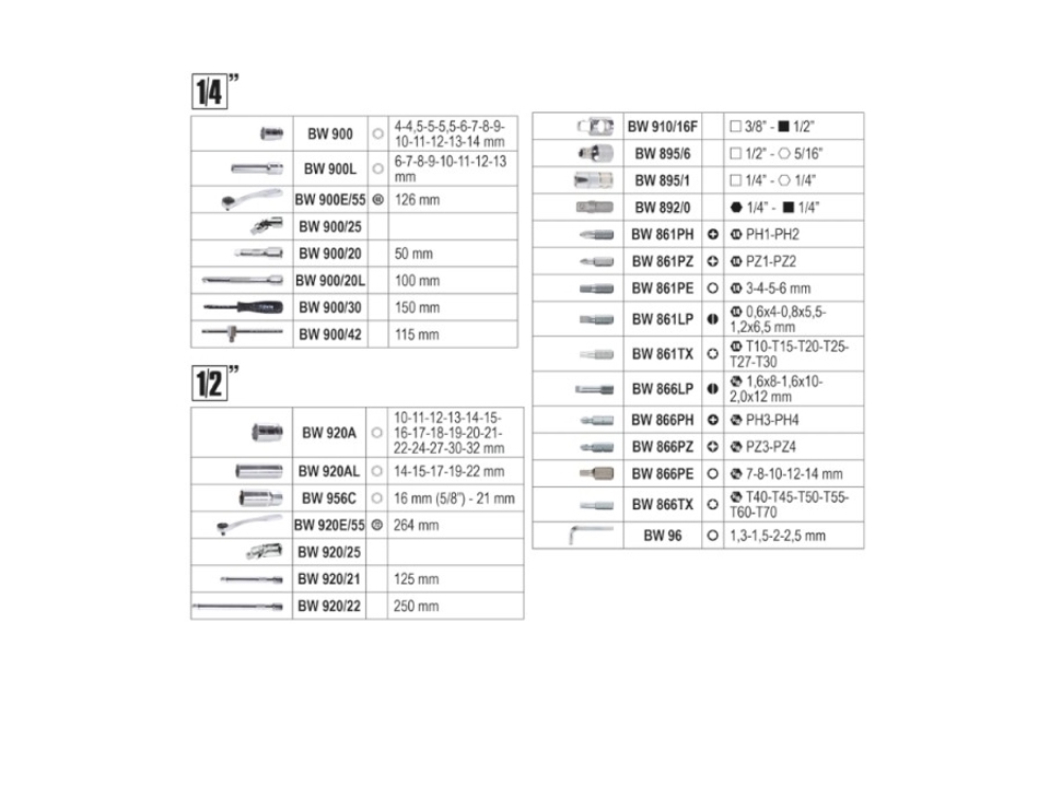 Valigetta con cricchetti e chiavi a bussola Beta, in acciaio basso legato al cromo -vanadio,composta da 98pezzi il tutto racchiuso in una pratica valigia in plastica con l'organizzazione degli inserti. Il set du bussole è composto da:Chiavi a bussola cod. C900 attacco da 1/4" : 4 - 4. 5 - 5 - 5. 5 - 6 - 7 - 8 - 9 - 10 - 11 - 12 - 13 - 14 mmInnesto cod. C900AD da 1/4" a 1/4"Bussole allungate cod. C900L da : 6 - 7 - 8 - 9 - 10 - 11 - 12 - 13 mmSnodo cod. C900/25Prolunga flessibile cod. C900FL L=145 mmQuadro maschio da 1/4" scorrevole cod. C900/42 da 115 mmQuadro maschio da 1/4" con impugnatura cod. C900/30 da 150 mmProlunga C900/20 L= 50 mmProlunga C900/20L L=100 mmCricchetto reversibile con attacco quadro maschio da 1/4" con meccanismo a 72 denti cod. C900E/55 L: 125 mm. - D: 25 mm. - A: 18 mmChiavi a bussola cod. C920A attacco da 1/2" : 10 - 11 - 12 - 13 - 14 - 15 - 16 - 17 - 18 - 19 - 21 - 22 - 24 - 27 - 30 - 32 mm. Bussole cod. C920L da :14-15-17-19-22 mmBussole allungate cod. C920/21 da 125 mmSnodo cod. C920/25Quadro maschio da 1/2" scorrevole cod. C920/22lunga 250 mmBussola cod. C956C da 16 mm. (5/8") + da 21 mm. (13/16")Cricchetto reversibile con attacco quadro maschio da 1/2" con meccanismo a 72 denti cod. C920E/55 L: 275 mm. - D: 40 mm. - A: 43 mmBussola portainserti cod. 895/6 da 1/2" a 5/16"Bussole portainserti con impronta Torx da 1/4" cod. 861TX : T10 - T15 - T20 - T25 - T27 - T30Bussole portainserti con impronta a Taglio cod. C866LP attacco 5/16=E2=80=9D: 1,6X8-1,6X10-2,0X12 mmBussole portainserti con impronta a croce Phillips attacco 1/4" cod. 861PH : PH1 - PH2Bussole portainserti con impronta esagonale cod. 861PE attacco 1/4=E2=80=9D : 3 - 4 - 5 =E2=80=93 6 mmBussole portainserti con impronta Pozidriv cod. 861PZ attacco 1/4=E2=80=9D : PZ1 - PZ2Bussole portainserti con impronta Pozidriv cod. C866PZ attacco 5/16=E2=80=9D : PZ3 - PZ4Bussole portainserti con impronta TORX ATTACCO 5/16" 866TX: T40 - T45 - T50 - T55 - T60 - T70Raccordo cod. 892/0 attacco esagonale 1/4=E2=80=9D maschio a attacco quadro 1/4Raccordo cod. C910/16F da attacco quadro 1/2=E2=80=9D a attacco quadro 3/8=E2=80=9D femmina Bussole portainserti con impronta a taglio cod. 861LP 1/4=E2=80=9D : 0,6X4-0,8X5,5-1,2X6,5 mmBussole portainserti con impronta a croce Phillips cod. C866PH attacco 5/16" : PH3 - PH4Bussole portainserti con impronta esagonale cod. 866PE attacco 5/16=E2=80=9D : 7 - 8 - 10 - 12 - 14 mmBussola cod. C895/6 da 1/2" a 5/16"Chiavi a brugola piegate cod. 96 da 1,3-1,5-2-2,5 mm
