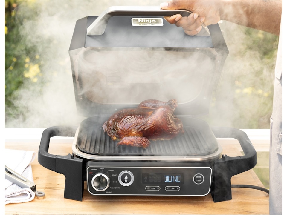 Scopri un nuovo modo di cucinare all'aperto con il Barbecue elettrico e affumicatore Ninja Woodfire. Griglia, affumica, friggi ad aria e molto altro con il vero sapore della cottura a legna, autentico al 100%.