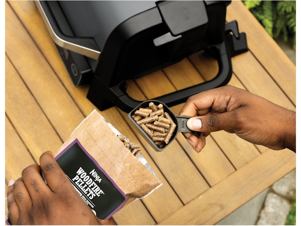 La griglia include 2 confezioni di pellet Woodfire dei diversi aromi e l'apposito misurino per un dosaggio perfetto. È possibile acquistare pellet Ninja Woodfire aggiuntivi direttamente da Ninja. .