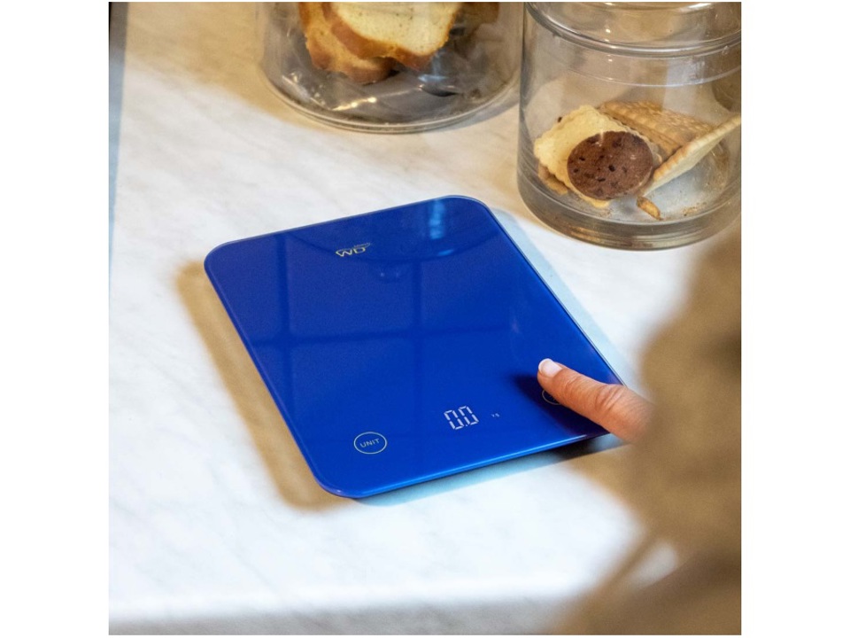 Bilancia digitale colorata ultraslim. Il design moderno e colorato dona originalità alla tua cucina. La bilancia di precisione misura oltre al peso (due unità di peso g e libbre convertibili), anche il volume dell'acqua e del latte (due unità di misura convertibili ml e fl oz). Sensibilità al grammo (1 g) con portata massima di 10 kg.