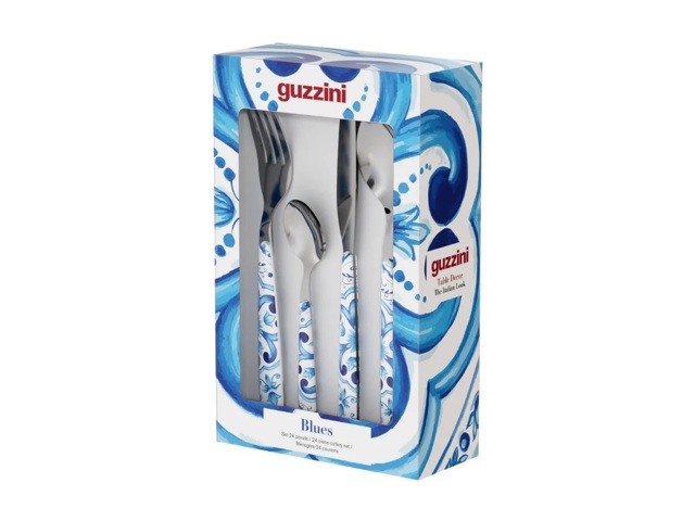 Le posate in acciaio con manico in plastica decorata ''Blues'' aggiungono un tocco di colore e allegria alla tavola.