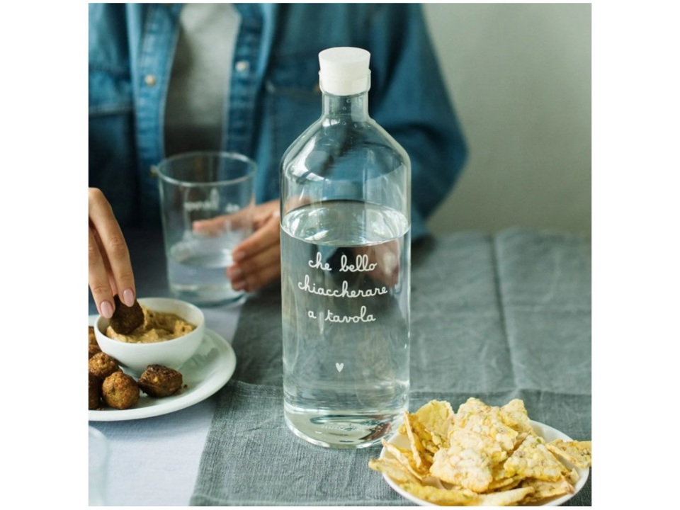 Bottiglia realizzata in vetro borosilicato, un materiale che ha caratteristiche uniche, infatti nonostante sia leggerissimo è molto resistente, super trasparente, molto brillante e facile da pulire