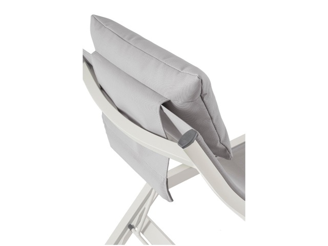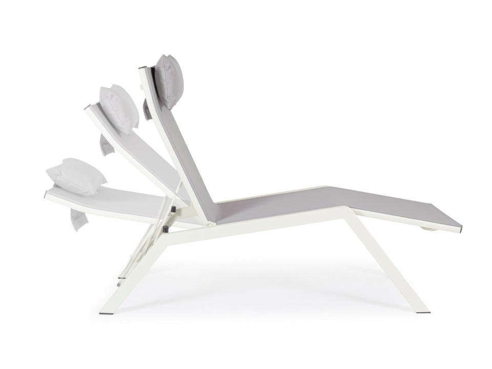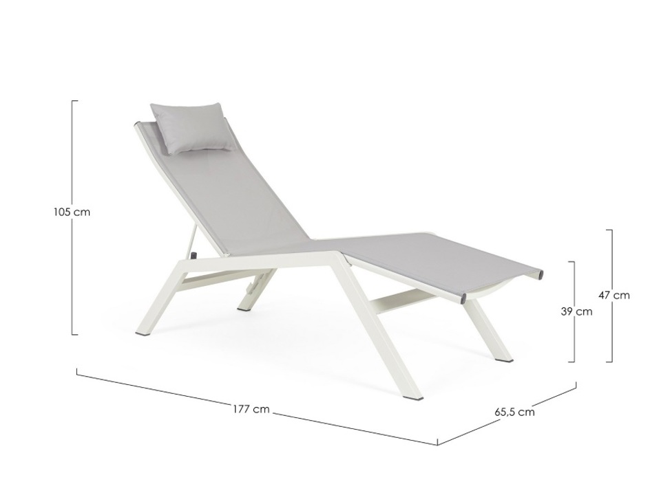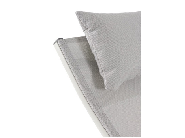 Struttura in alluminio verniciata a polvere (poliestere). Rivestimento in textilene 1x1. Schienale reclinabile in 3 posizioni. Cuscino poggiatesta con imbottitura per esterno fast dry foam, removibile e sfoderabile. Viteria in acciaio inossidabile. Da assemblare.