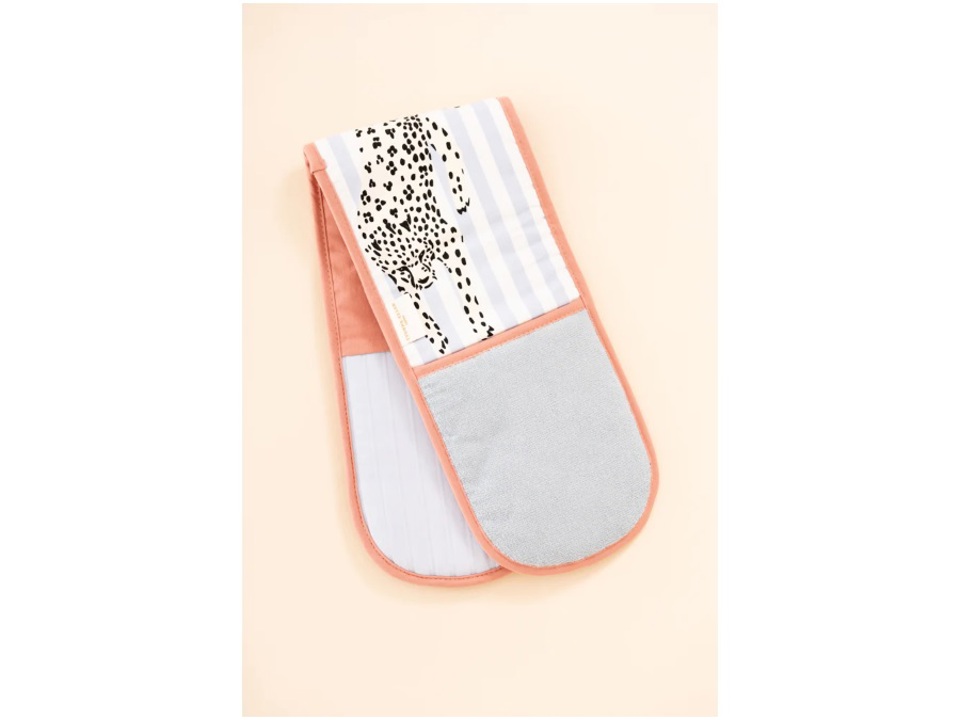 Aggiungi questo sfacciato ghepardo alla tua cucina con questo doppio guanto da forno color pastello! Sono fittamente trapuntati per proteggere le mani dal calore e hanno impugnature in gomma all'interno per una maggiore sicurezza! Abbinalo ad altri accessori da cucina per un look finale elegante!
