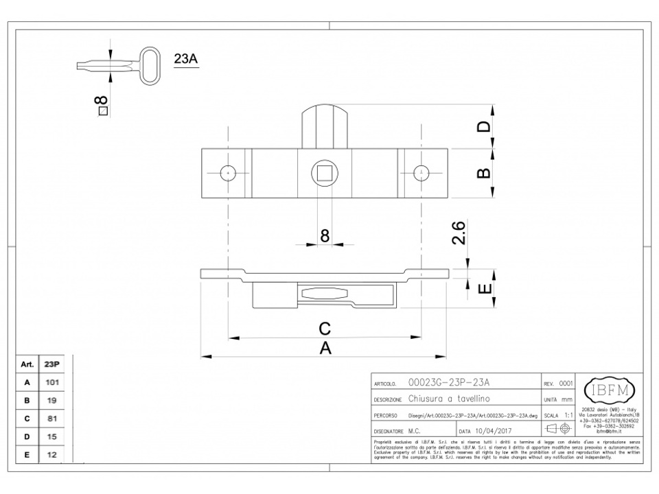 Chiusure tipo piccolo con foro quadro, da avvitare su ante metalliche di armadietti, con chiave monouso su richiesta (Art. 23/A)