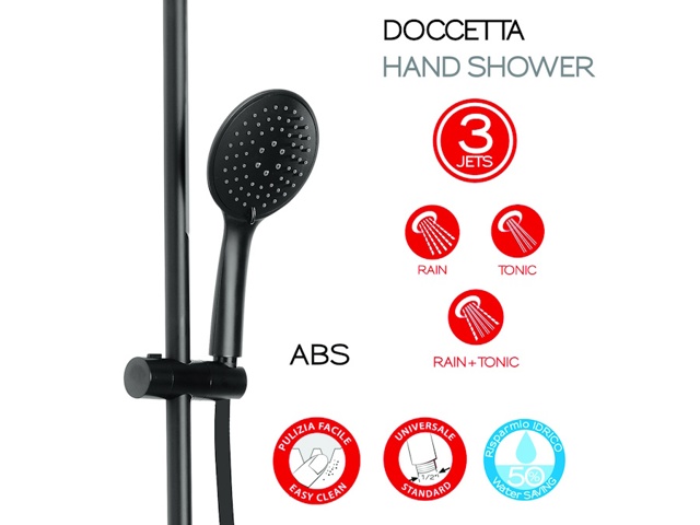Colonna doccia estensibile 84-127 cm, miscelatore termostatico, soffione 1 getto 22,5=C3=9722,5 cm, doccetta a 3 getti, flessibile acciaio inox 150 cm doppia aggraffatura 1/2=C3=971/2 con conico antitorsione. Plus prodotto: presenza di microfori che crea un effetto nebuloso, attacco universale, filtro antisabbia e ha una riduzione di risparmio idrico del 50%. Ugelli con sistema di pulizia facile. Il flessibile è antitorsione, resistente alle piegature ed è resistente ad una temperatura di 90°