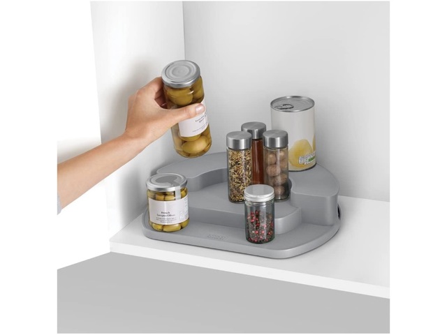 Questa soluzione di stoccaggio semplice ma efficace è dotata di una piattaforma ribassata con tre livelli su una base rotante, che facilita l'accesso da tutte le angolazioni e solleva gli oggetti sul retro.