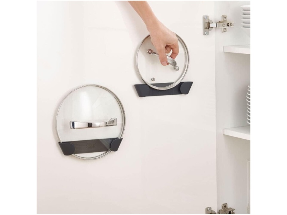 Ogni singolo supporto in questo set di 4 supporti per coperchi può essere montato all'interno dell'anta di un armadio per mantenere la cucina organizzata e trovare facilmente il coperchio di cui hai bisogno.