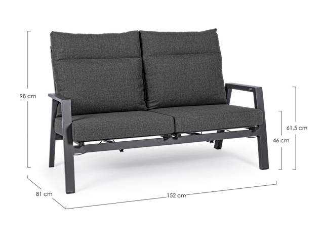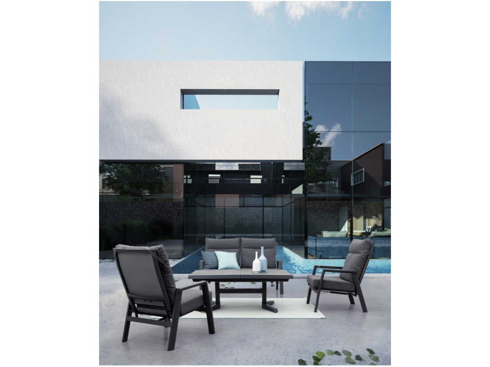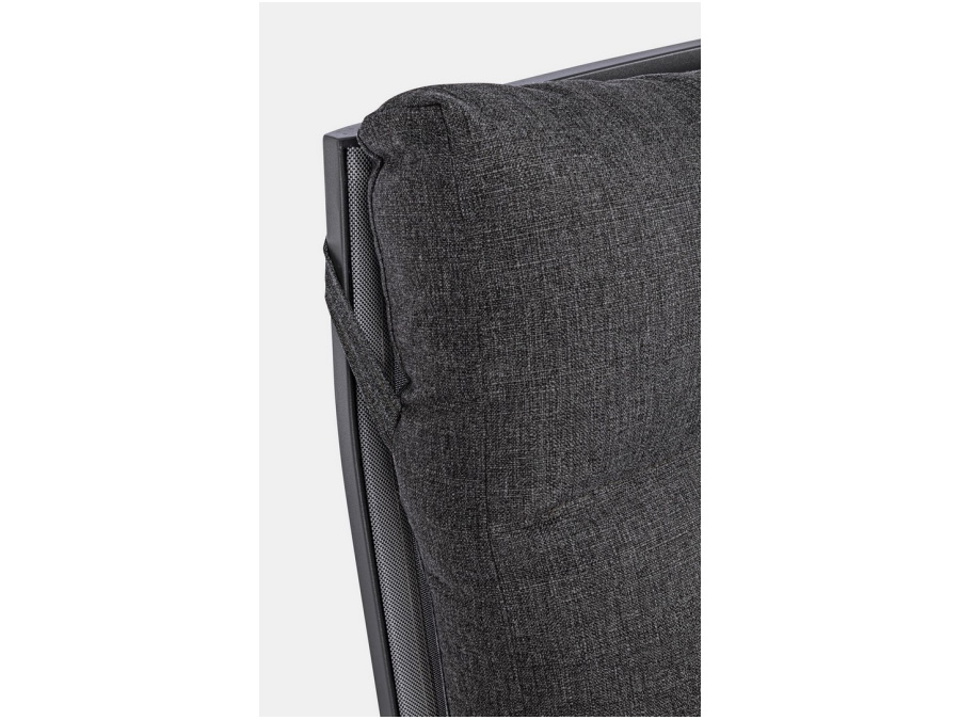 Struttura in alluminio verniciata a polvere (poliestere). Schienale reclinabile in libera posizione e seduta in textilene 1x1. Cuscini sfoderabili con tessuto olefin (100% polipropilene).