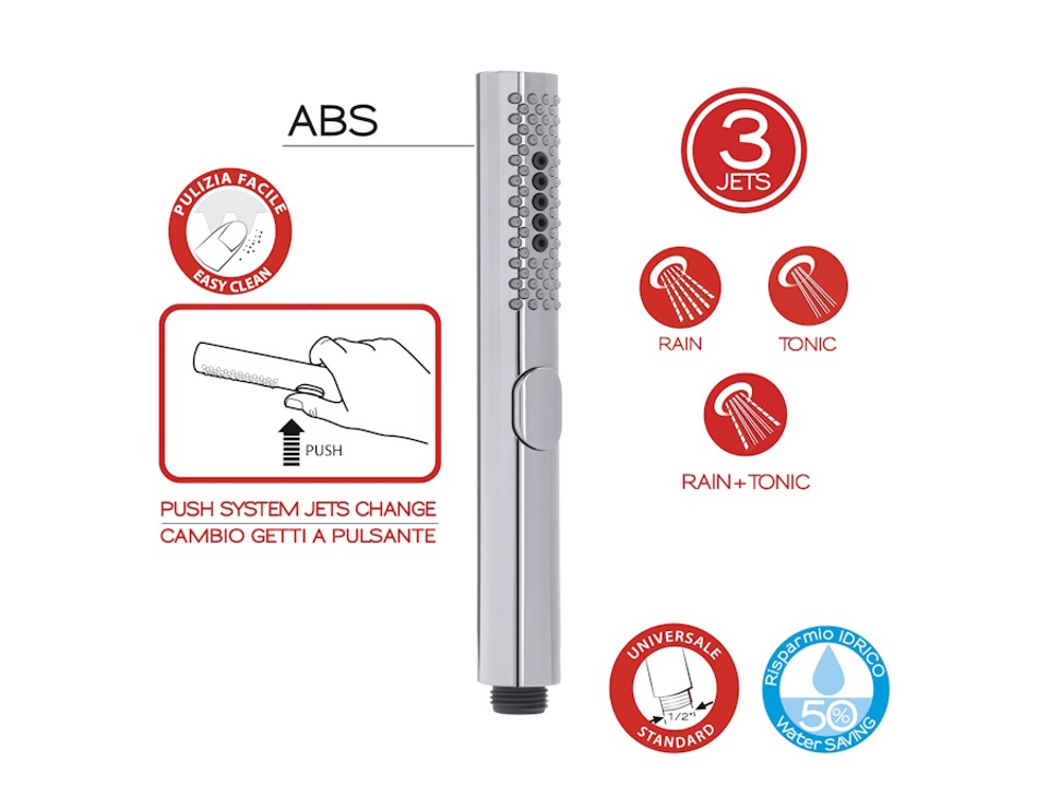 Doccetta a 3 getti con cambio getti a pulsante, attacco universale, filtro risparmio acqua. Ugelli con sistema di pulizia facile.