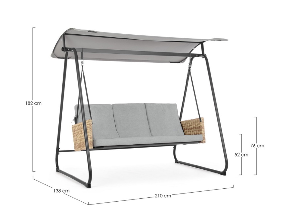 Struttura in acciaio trattato per esterno tramite fosfatazione, verniciato a polvere (poliestere) . Pali 48/32/28/16mm. Rivestimento braccioli in polyrattan resistente ai raggi uv. Seduta e schienale in oxford pvc 300x600d. Cuscino in poliestere 160 gr/m2 imbottito. Seduta sfoderabile. Tettuccio in poliestere 180 gr/m2 regolabile in libera posizione. Viteria galvanizzata. Da assemblare