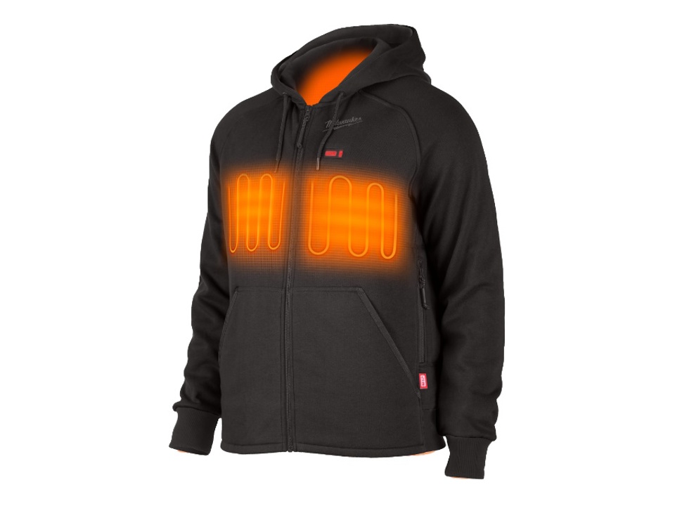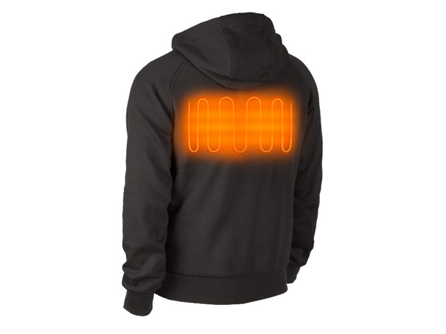 La felpa con cappuccio riscaldata M12 alimentata da una batteria M12 con elementi riscaldanti in fibra di carbonio crea e distribuisce calore dal torace e alla schiena.