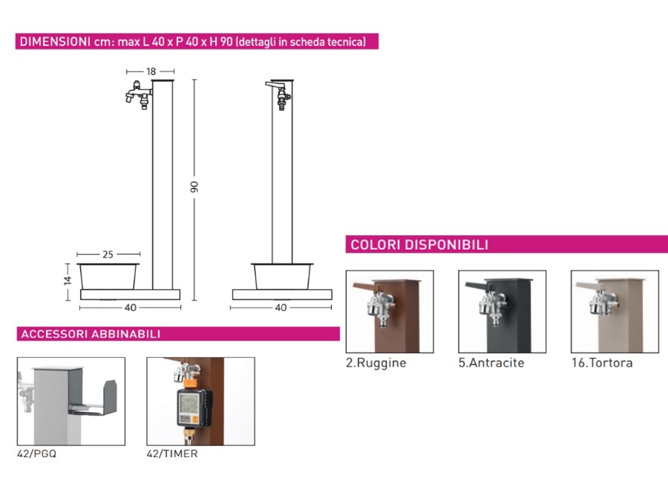 Rubinetti: A sfera in ottone con doppia uscita, principale con aeratore, secondario con attacco gomma rapido