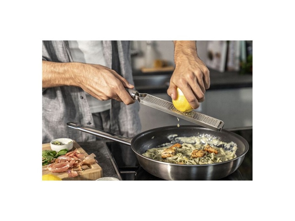 Grattugiare bucce di limoni e arance? In un batter d'occhio. Grattugiare la noce moscata direttamente nelle verdure? È facile. Raffinare la pasta con delicate scaglie di tartufo? Nessun problema: con la grattugia zester ZWILLING PRO. Abbiamo messo tutta la nostra esperienza nella produzione di lame affilate in questa grattugia. I denti della grattugia sono particolarmente affilati e grazie alla tecnologia di taglio bidirezionale, è possibile grattugiare in entrambe le direzioni molto rapidamente e senza sforzi.