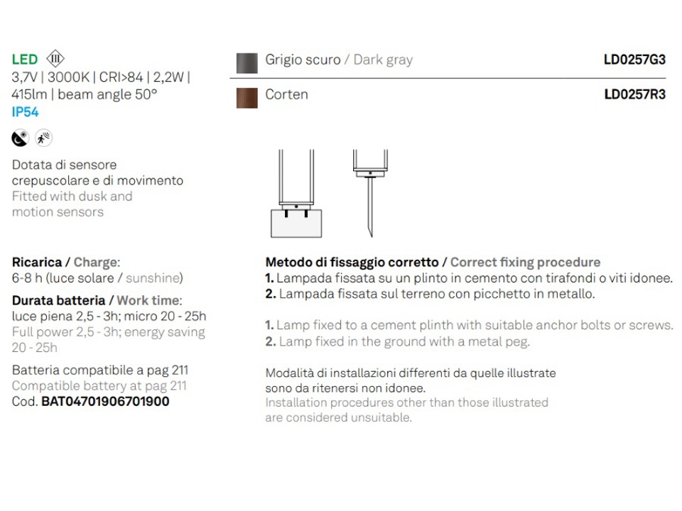 Home Solar è un pratico paletto adatto all'uso esterno (IP54) disponibile in due colori, grigio scuro e corten, e in due altezze, 50cm e 100cm. La sorgente a LED è alloggiata nella parte superiore della struttura in alluminio ed emette luce diretta verso il basso.