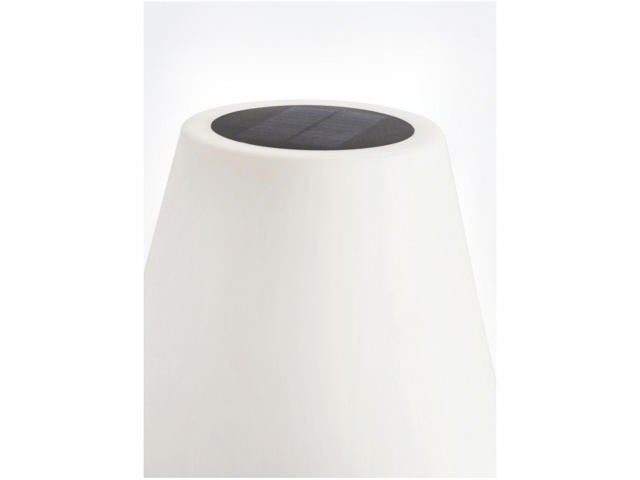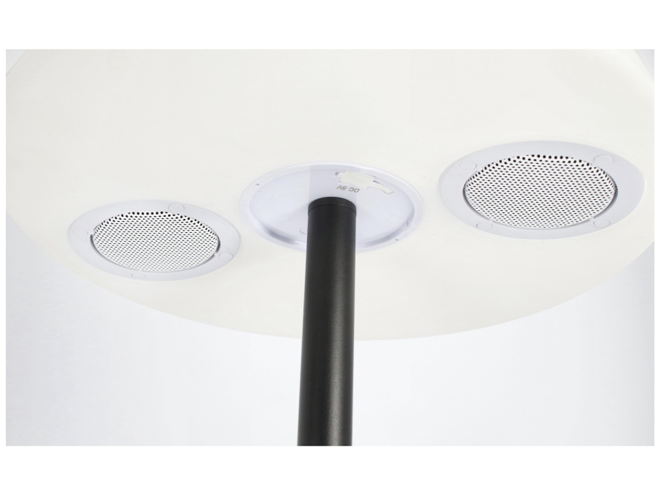 Pe, acciaio verniciato a polvere epossidica. Lampada led, 7 colori, altoparlante bluetooth. Batteria ricaricabile con cavo usb 2 mt incluso. Anche a ricarica solare. Telecomando a distanza per regolazione cambio colore incluso. Per uso interno ed esterno, ip44. Da assemblare.