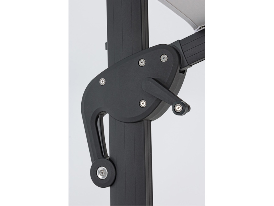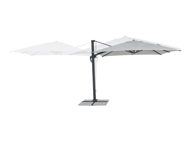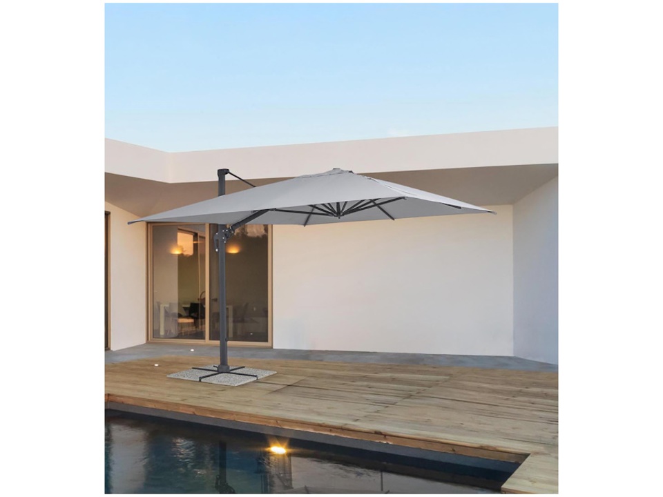 Struttura in alluminio verniciata a polvere (poliestere). Palo 93x57mm. 8 stecche 28x18mm. Telo grigio chiaro in poliestere 250gr/m2 con rivestimento in pa (poliammide) con camino antivento. Base a croce in acciaio. Palo girevole 360° con pedalina. Inclinazione verticale con impugnatura a 4 posizioni. Comprensivo di copriombrellone. Marmette non incluse.