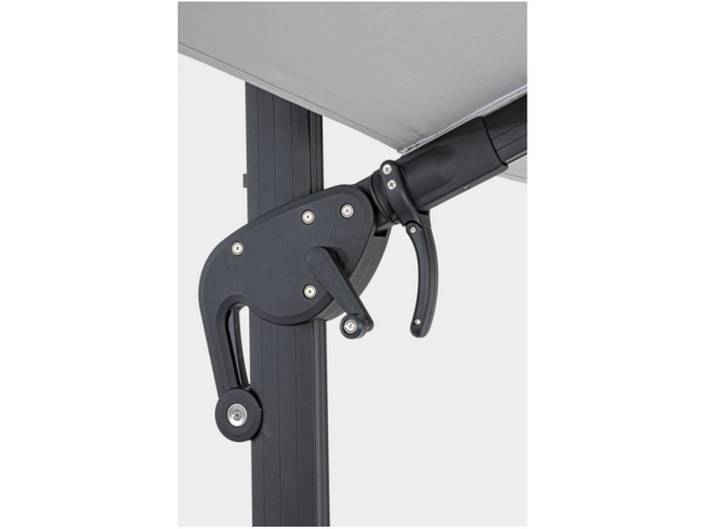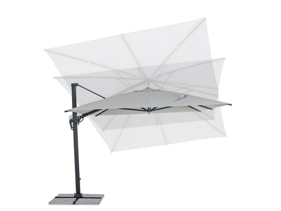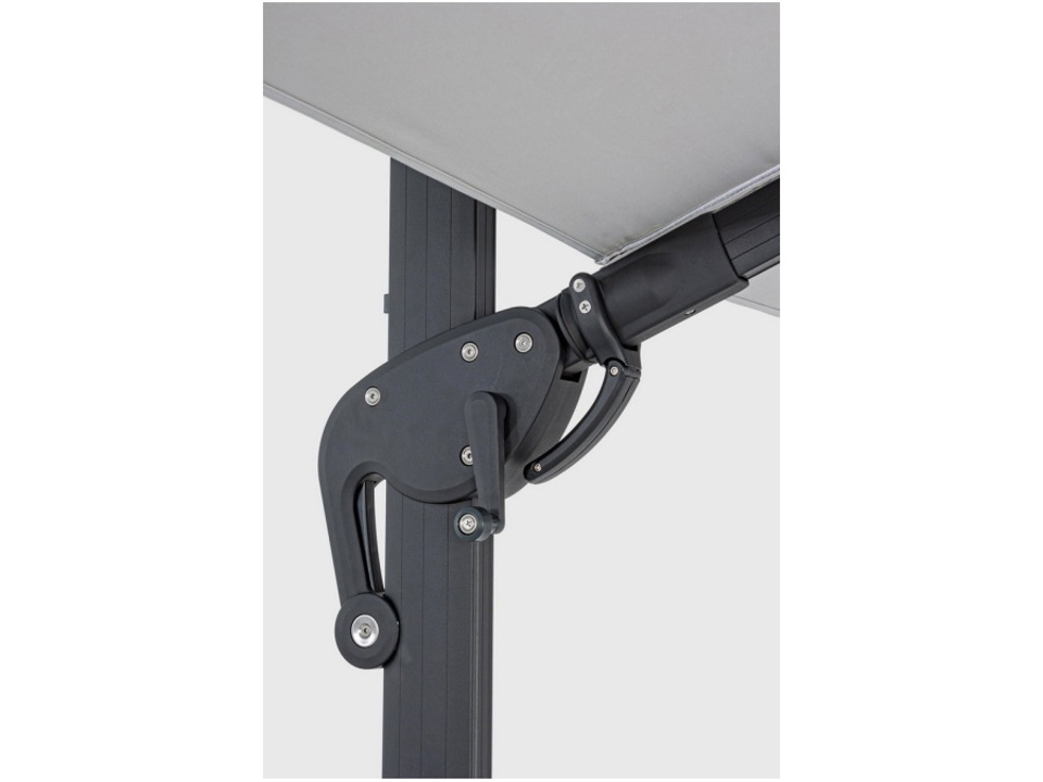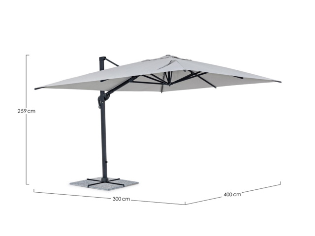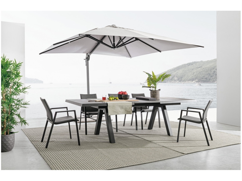 Struttura in alluminio verniciata a polvere (poliestere). Palo 93x57mm. 8 stecche 28x18mm. Telo grigio chiaro in poliestere 250gr/m2 con rivestimento in pa (poliammide) con camino antivento. Base a croce in acciaio. Palo girevole 360° con pedalina. Inclinazione verticale con impugnatura a 4 posizioni. Dotato di maniglia per inclinazione ombrello destra-sinistra.