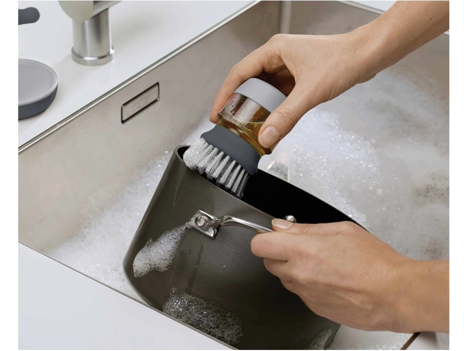 Questa robusta spazzola per piatti portatile è dotata di un serbatoio facile da riempire che eroga la quantità di sapone necessaria con una semplice pressione del pulsante superiore.