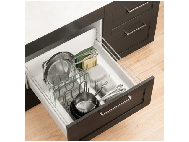 Stabilità Antiscivolo: l'organizer per pentole Peggy è progettato con piedini antiscivolo integrati, che assicurano la stabilità delle pentole all'interno dei cassetti o dei mobili da cucina.
