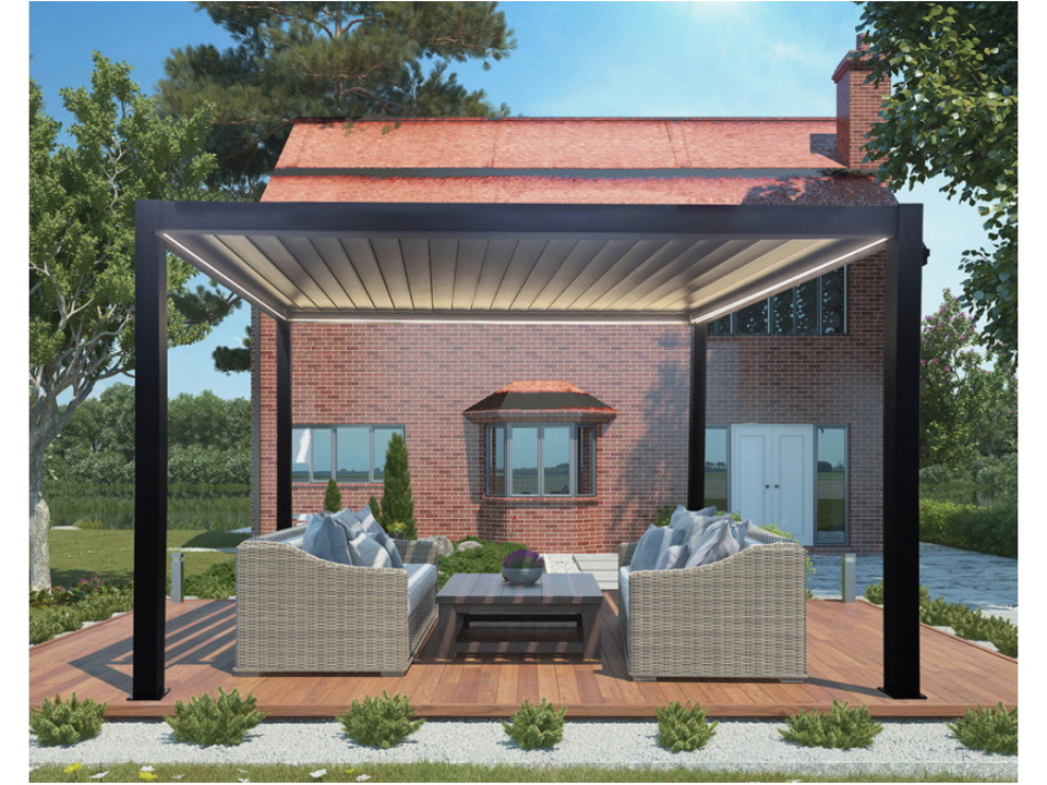 Struttura in alluminio bianco o grigio scuro copertura a lamelle frangisole orientabili a movimentazione elettrica con led e controllo da APP