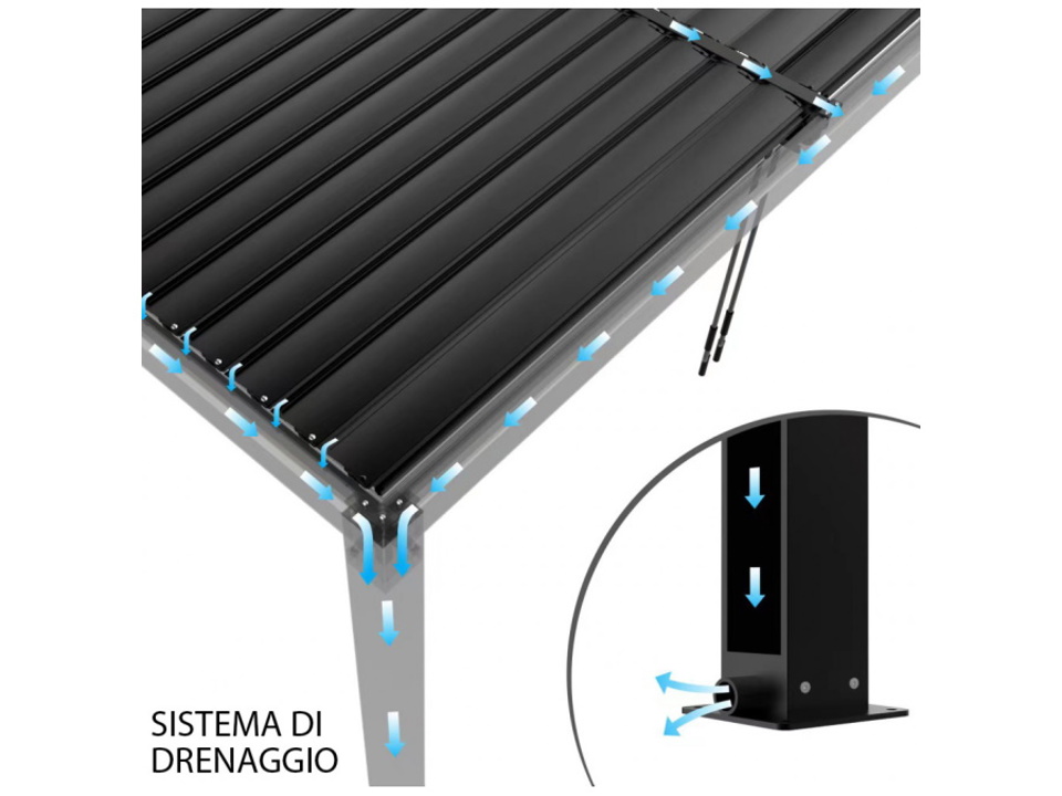 La pergola bioclimatica coniuga design ed efficienza, grazie a doppie lamelle che offrono una copertura lineare e pulita quando chiuse. Robuste colonne da 12 cm assicurano stabilità. La motorizzazione e l'app mobile permettono la regolazione delle lamelle fino a 120°, per un controllo personalizzato di luce e ventilazione, trasformando l'area in un'oasi di benessere. L'illuminazione a LED integrata eleva l'estetica, rendendo la pergola un elemento distintivo dell'arredo esterno che combina praticità e stile, per un'esperienza all'aperto raffinata e tecnologicamente avanzata.