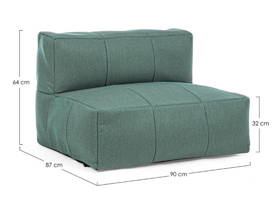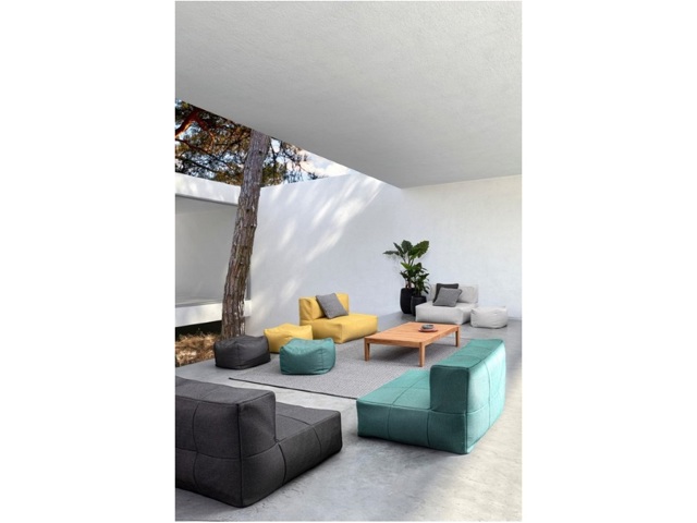 Struttura in alluminio. Rivestimento sfoderabile in tessuto olefin (100% polipropilene), idrorepellente e resistente ai raggi uv (grado 7). Imbottitura in polistirene espanso (eps) con l'aggiunta di quick dry foam nella seduta.