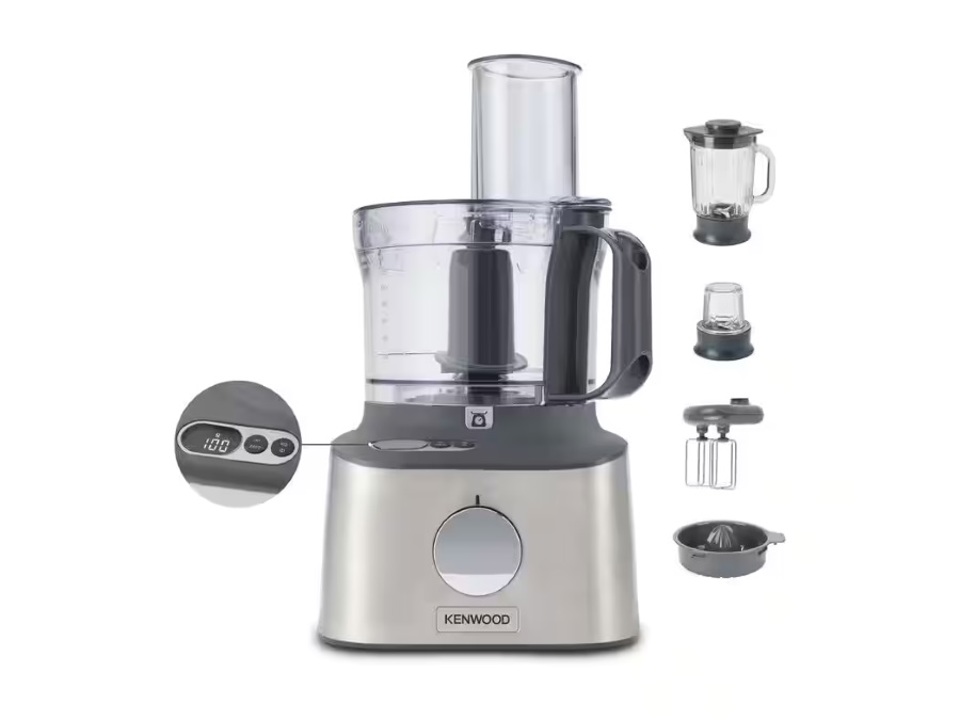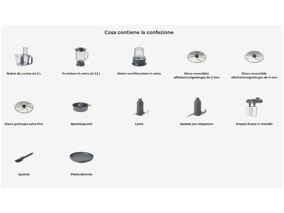 *L'unico robot da cucina compatto dotato di bilancia integrata, doppia frusta in metallo, frullatore in vetro e accessori per macinare.