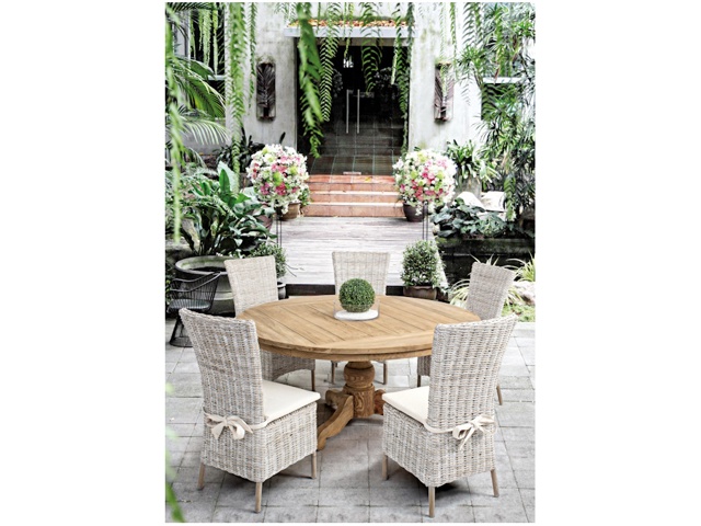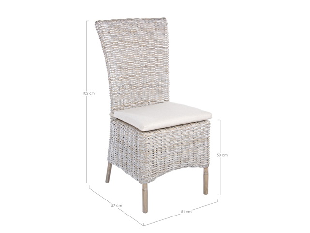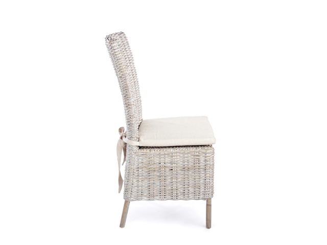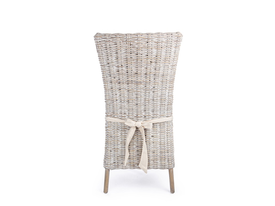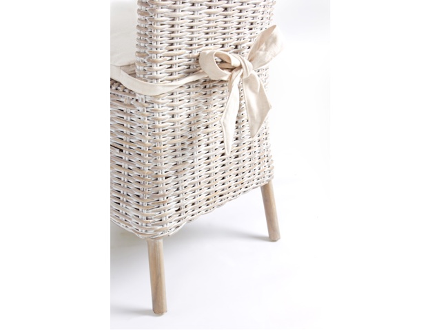 Struttura in rattan, intreccio in kubu, finitura a base di nitrocellulosa. Cuscino sfoderabile con tessuto per uso interno (lino) con nastro annodato dietro schienale. Si raccomanda di non esporre l'articolo alla luce diretta del sole e alle intemperie. Imballo senza cartone.