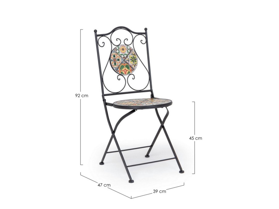 Struttura in acciaio trattato per l'esterno (e-coating) e verniciato a polvere epossidica. Seduta e schienale con decoro in ceramica. Pieghevole