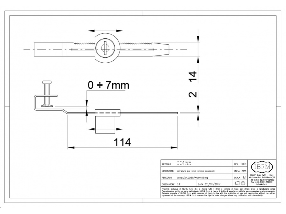 Serratura a cremagliera per ante scorrevoli. L'asta dentata viene fissata sul lunotto, il cilindro della serratura viene poi inserito sulla cremagliera bloccando le due ante.