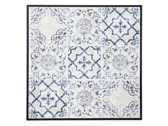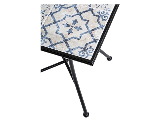 Struttura in acciaio trattato per l'esterno (e-coating) e verniciato a polvere epossidica. Piano, seduta e decori in ceramica. Sedia pieghevole. Tavolo gambe da assemblare.