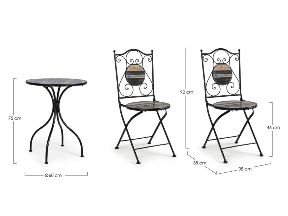 Struttura in acciaio trattato per l'esterno (e-coating) e verniciato a polvere epossidica. Piano, seduta e decori in ceramica. Sedia pieghevole. Tavolo gambe da assemblare.
