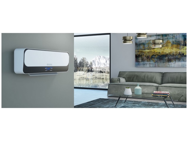 Termoventilatore a parete da 2000 W, con tre diversi livelli di erogazione del calore e dotato di un ampio flap oscillante per direzionare il flusso dell'aria. Il timer integrato permette di programmarne il funzionamento dell'intera settimana.
